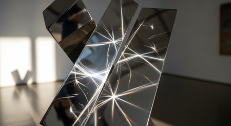A close-up of a modern, abstract sculpture crafted from highly polished black metal. Sunlight reflects off its sharp angles and flat surfaces, creating brilliant, starburst-like flares and intricate patterns of light. The image highlights concepts of modern art, design, reflection, and light.