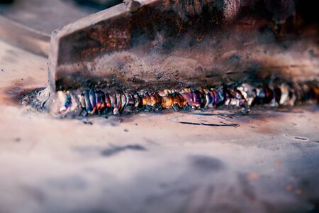 close up of welding of two iron slab in hot position by electric machine
