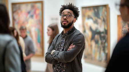 An engaging tour guide captivates a museum group with lively discussions about the art and its historical significance.