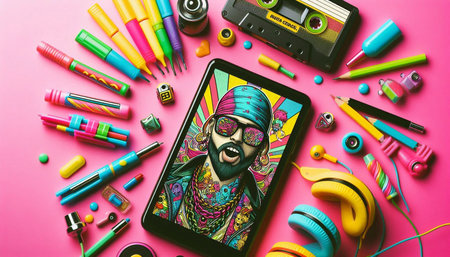 A bold and colorful illustration featuring a punk-style man with a mobile music recorder in vibrant candy tones.