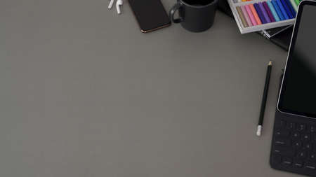 Top view of modern workplace with copy space and office supplies on dark grey background