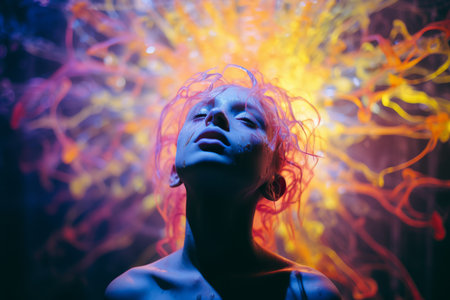 Beautiful young woman dancing and making party with fluorescent painting on her face. Neon facial portraits