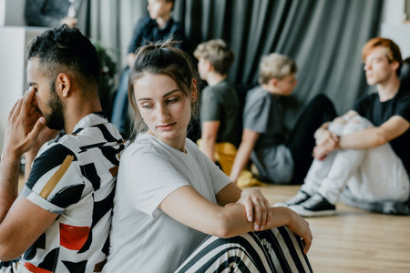 Top view of rebellious teenagers during therapy with psychologist