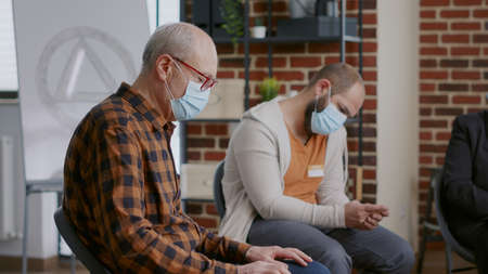 People sitting in circle at aa meeting during virus pandemic. Patients with face masks attending support group therapy session, preparing for discussion and counseling from therapist.