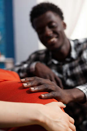 Closeup of joyful african american future father touching pregnant caucasian woman baby bump and feeling unborn child moving. Cheerful multiethnic young couple expecting newborn at home