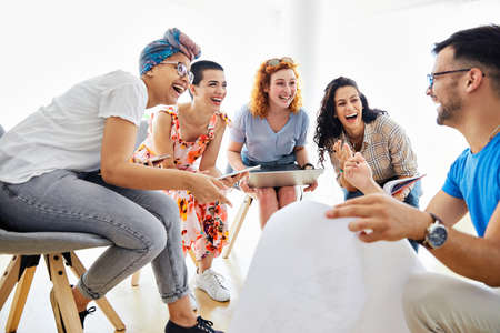 Top view of psychologist talking with difficult young people about problems