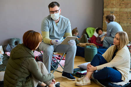 Male clinician in uniform and mask giving medical advice to one of young female refugees sitting on sleeping place on the floor of camp