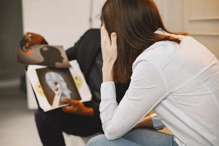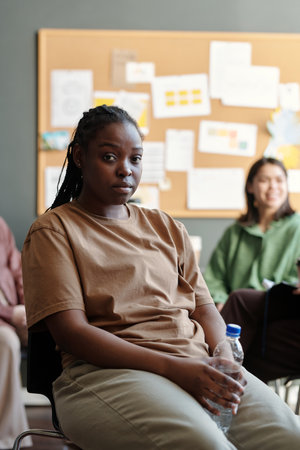 Young upset African American woman in casualwear looking at camera while sitting in psychologist office against female patients