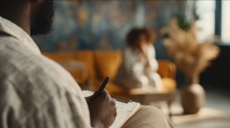 An African-American counselor takes structured notes in a warm, brown-toned workspace. The blurred client in the distance adds to the calm, supportive, documentary-style ambience.