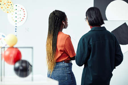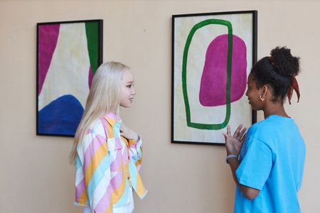Minimal side view portrait of two teen girls discussing pictures in modern art gallery