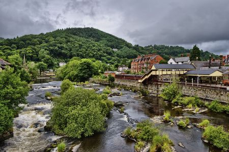 street view of the old town of Cardigan with the shire hall on the main street in a Sunday summer