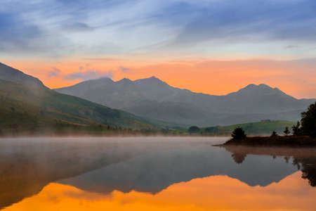 Aerial view of beautiful mountain lakes in North Wales (Llyn Glaslyn, Snowdonia, Wales, UK)