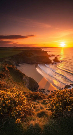 Golden light bathes the rugged cliffs and crystal-clear water, highlighting a picturesque beach with a rocky outcrop. Wildflowers add vibrant colors to the foreground.