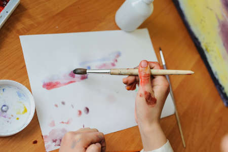 Closeup of women's hand with brush drawing on notepad. Creation process of watercolor painting