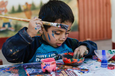 Yungay, Peru, August 4, 2014: portrait of happy naughty boy with paint stained face, clothes and hands doing crafts with brush in hand and dripping paint