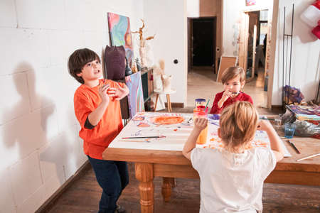 Playful student painted or draw canvas at stained wall with diverse friends in art lesson. Group of happy multicultural children working or create artwork at messy room. Creative activity. Erudition.