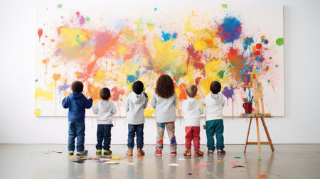 Diverse happy children paint canvas together with colorful stained wall. Smart multicultural student drawing together in art lesson while wearing white shirt. Creative activity concept. Edification.