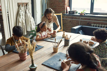 Group of kids and their teacher leaning over table with watercolor paints and painting self-made clay items. Children with teacher in art class