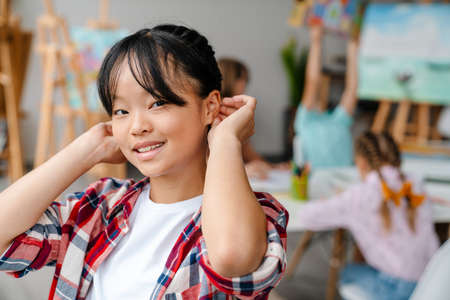 Young caucasian beautiful girl is looking at camera in a group drawing lesson