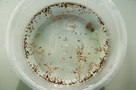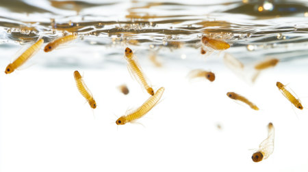 Three specimens of mosquito larvae or wrigglers of the species called Toxorhynchites speciosus, which is a large mosquito that feed on plant sap and nectar (not blood)