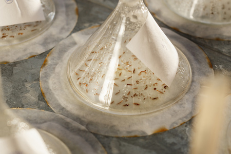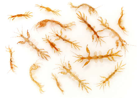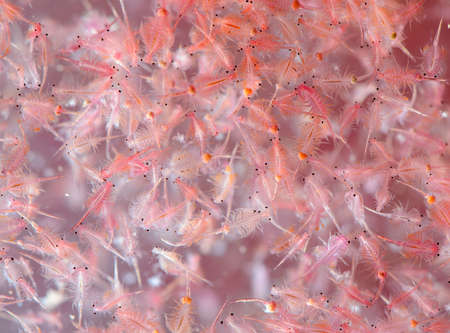 Closeup gills of shrimp under light microscope, Shrimp larvae under a microscope. Shrimp, White shrimp, Nauplius, Zoea, Mysis, Larvae. Background.