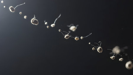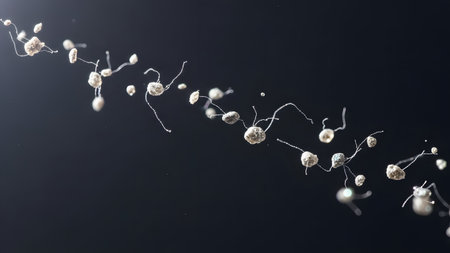 A microscopic view of sperm cells navigating through a dark environment, highlighting their movement and structure as they swim towards the egg for fertilization.