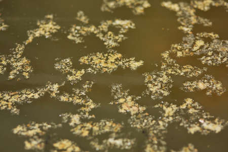 Contaminated flowering water surface. Environmental disaster of the environment. Dumping garbage into rivers and oceans. High quality photo