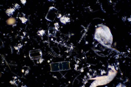 Microscopic water insects, tiny water fleas or aquatic larvae, microscopic world within a droplet of water.