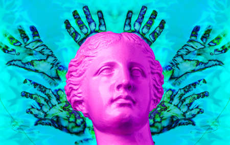 Purple pink antique bust on a modern conceptual art background with hands. Contemporary art collage.