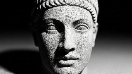 Textured marble bust of ancient Greek man, dramatic light, dark background.