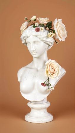 A classical marble statue of a serene female figure is presented against a vibrant floral wallpaper, creating a juxtaposition of timeless art and delicate nature.