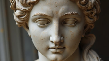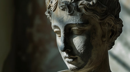 Close-up of an ancient marble statue with intricate details, showcasing classical artistry against a dark background