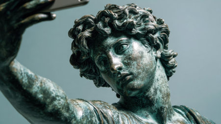 This captivating image showcases an ancient bronze sculpture holding a smartphone, merging timeless artistry with modern technology, depicting cultural evolution.