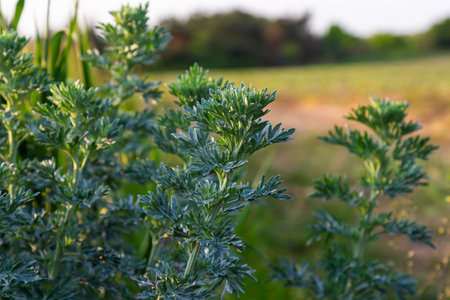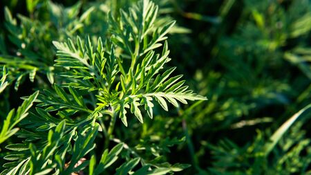 Ambrosia. Close-up of annual ragweed green leaves with selective focus on foreground
