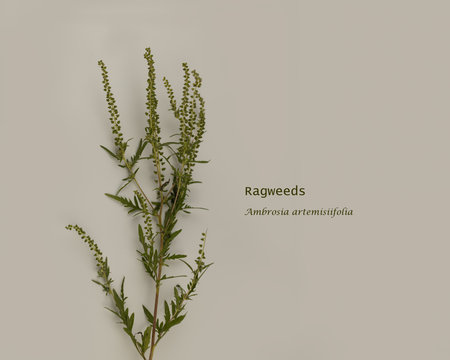 Blooming Ambrosia artemisiifolia on beige background. Ragweed is a dangerous allergenic plants, weed bushes pollen causes allergies. World Allergy Awareness Day. Text Name of plant.
