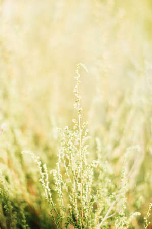 Ragweed bushes of sunset over meadow. Ambrosia artemisiifolia dangerous allergy-causing plant to meadow among summer herbs. Weed bursages and burrobrushes whose pollen is deadly for allergy sufferers