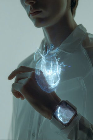 Close-up of female doctor looking at hologram of human heart