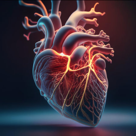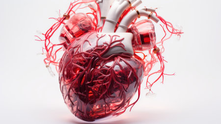 A detailed 3D rendering of a human heart prominently displaying its structure and connected blood vessels against a soft background, emphasizing anatomy and biological detail.