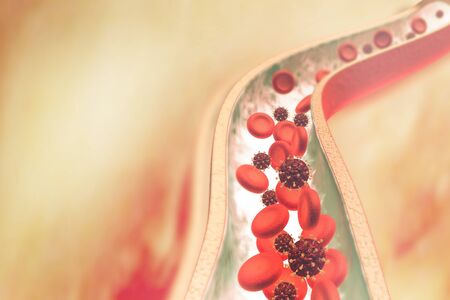 3D Illustration of red blood cells, white blood cells and cholesterol clogging the cause of death. medical use science, education