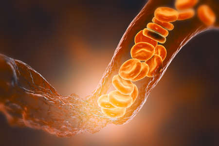 3d illustration of red blood cells inside an artery, vein. Healthy arterial cross-section blood flow. Scientific and medical microbiological concept. Enrichment with oxygen and important nutrients.