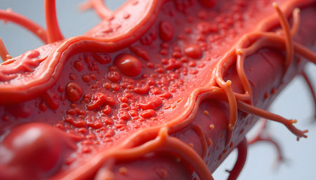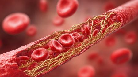 This close-up image illustrates a blood vessel containing red blood cells and plaque buildup, highlighting issues related to cardiovascular health and anatomy.
