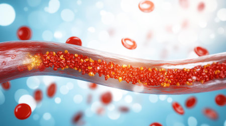 Close-up illustration of cholesterol deposits in blood vessels. Arterial plaque buildup depicted in vivid detail. Useful for medical training, health awareness, and scientific visualization.