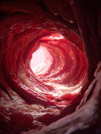 Red blood cells are flowing through an artery, transporting oxygen and nutrients throughout the body in this highly detailed medical visualization