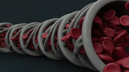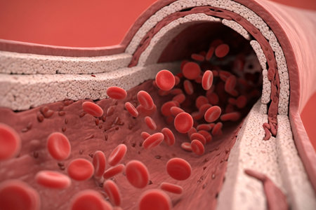 Anatomical 3D rendering of blood vessel layers with red blood cells in motion, representing human circulatory health and vascular system design.
