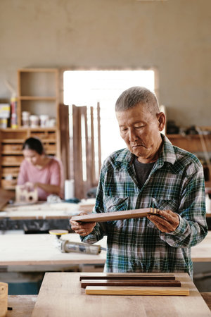 Pensive concentrated carpenter checking quality of walnut and maple wooden pieces fused together