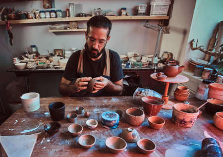 Pensive entusiastici potter in glasses at his own workshop is workig on a new handmade teapot.