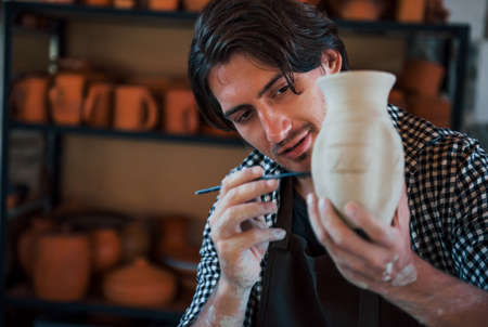 Young ceramist holds his fresh handmade pot and makes some detalizing by special tool stick.