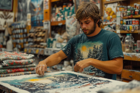 A focused person applies a unique design to a T-shirt using a printing technique, creating a fashionable and expressive wardrobe item.