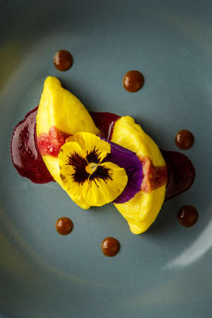 vertical view on two big yellow dumplings decorated with red sauce and fresh flower served on blue restaurant plate