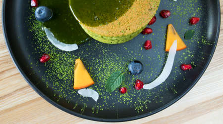 Matcha green tea macadamia cake on a white table. Free space for text . Top view